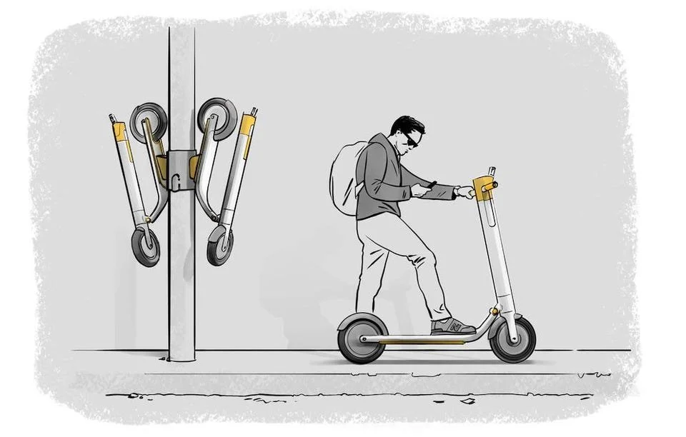 The name is a literal translation from Dutch for scooter. It is also a metaphor for small, controllable and safe movement - micro-mobility evolving step-by-step. Step can be stored on poles or folded into a smaller self-standing package, so as to help declutter sidewalks. The mechanism also helps contribute to a longer, more stable wheel base. An on-board camera brings computer vision intelligence, requiring the use of helmets and enforcing safe speeds amongst pedestrians. A public application program interface (API) allows for easy pull of data on accidents and unsafe riders. Intrigued, I got in contact with lead designer Guus Baggermans and industrial designer Hayes Urban to find out more.